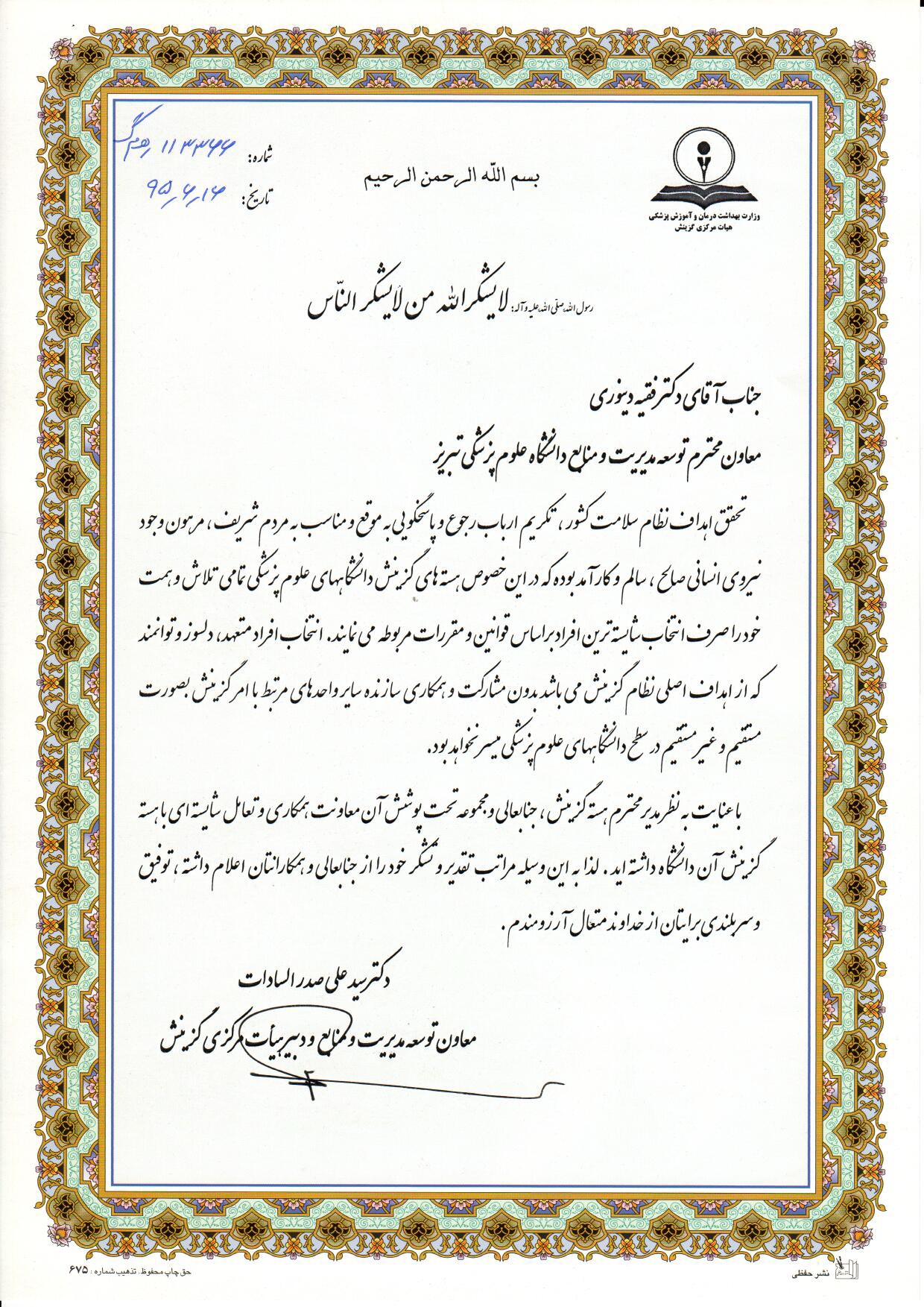 تقدیر جناب آقای دکتر سید علی صدرالسادات معاون محترم توسعه مدیریت و منابع و دبیر هیات مرکزی گزینش وزارت بهداشت درمان و آموزش پزشکی از جناب آقای دکتر مسعود فقیه دینوری، معاون محترم توسعه مدیریت و منابع دانشگاه